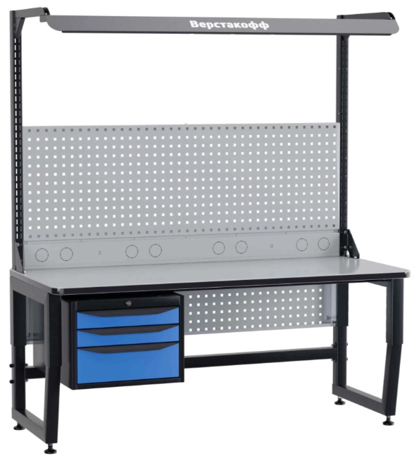 Цвет опор и каркасных элементов RAL 9011 (серый), цвет тумб: корпус и ручки ящиков RAL 9011, лицевые панели ящиков RAL 5023 (синий), перфопанель и блок коммуникаций RAL 7047 (серый), блок освещения RAL 9011.